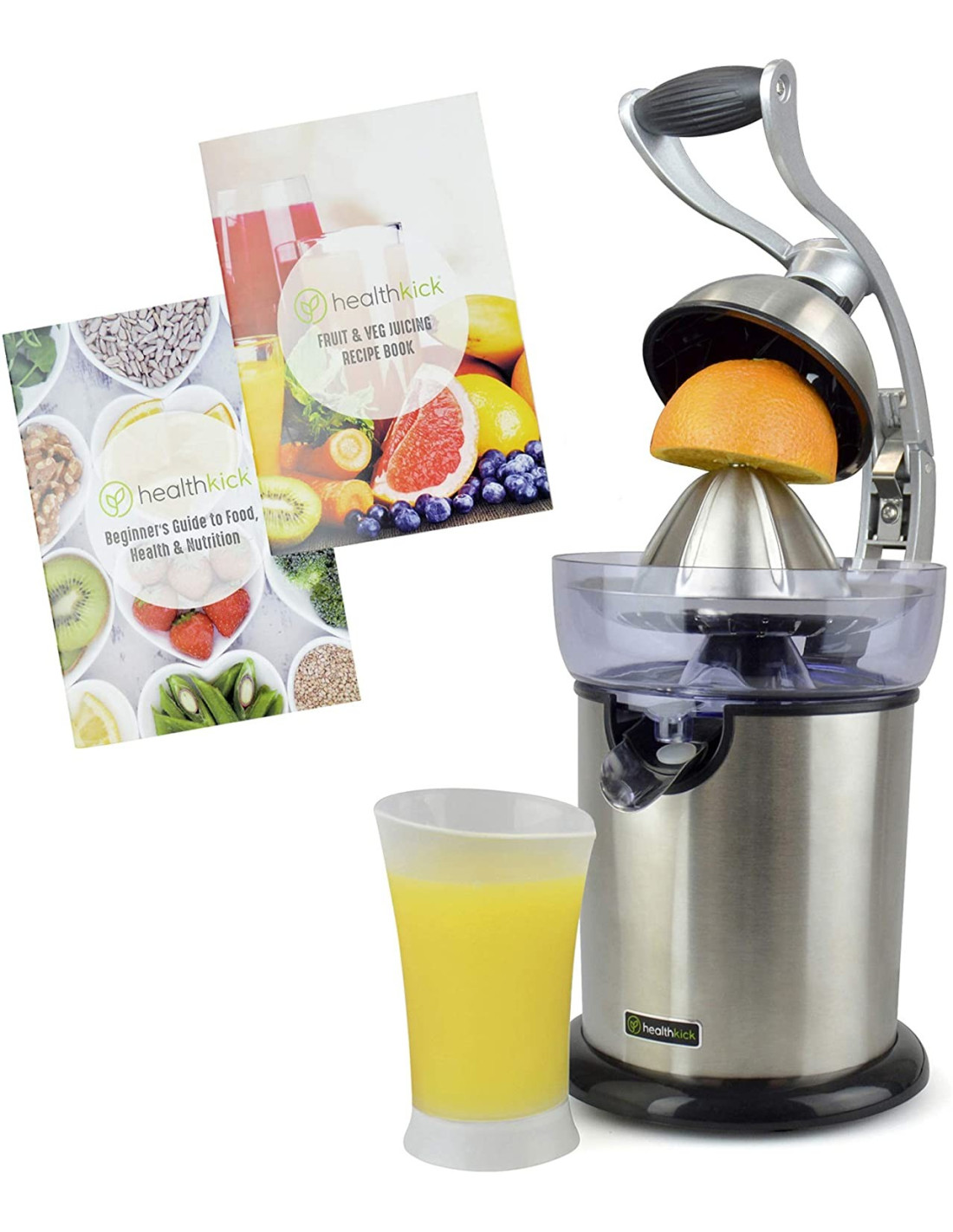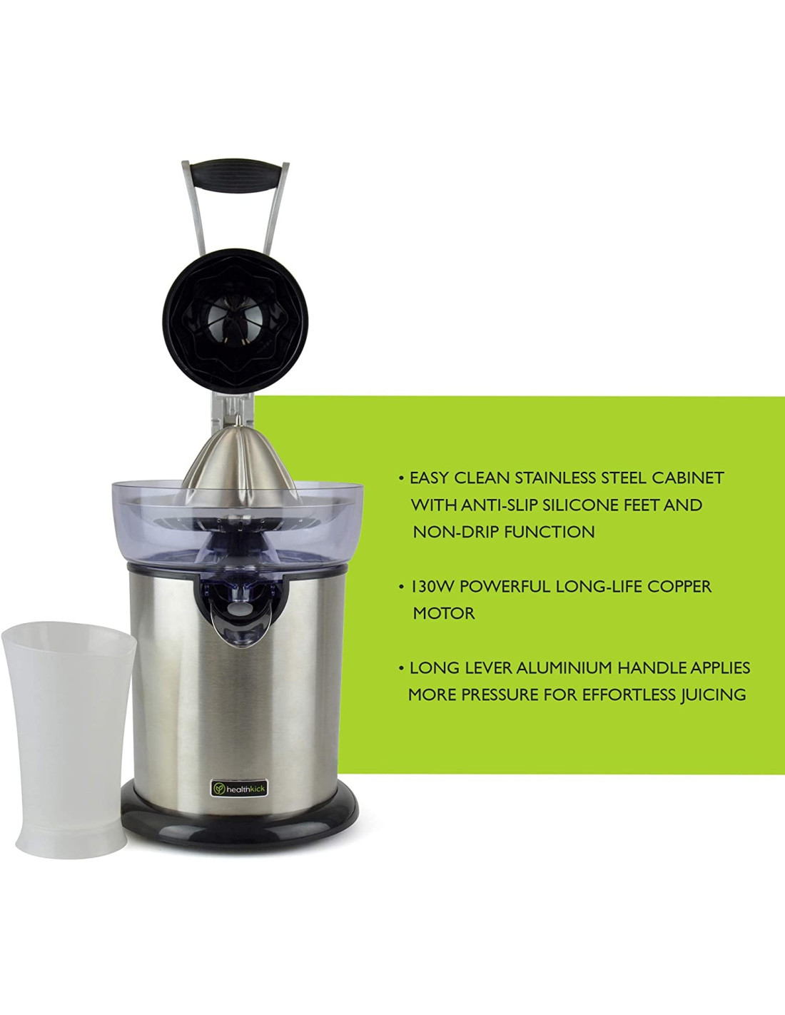 Ηλετκρικός στίφτης από ανοξείδωτο ατσάλι της Lloytron σειρά Health Kick για να απολαμβάνετε τους χυμούς σας χωρίς κόπο! Δε χρειάζεται πια να καταβάλλεται προσπάθεια για να στύψετε τους χυμούς σας αφού η μεγάλη ανοξείδωτη λαβή ασκεί μεγαλύτερη πίεση κατά το στύψιμο και σας διευκολύνει