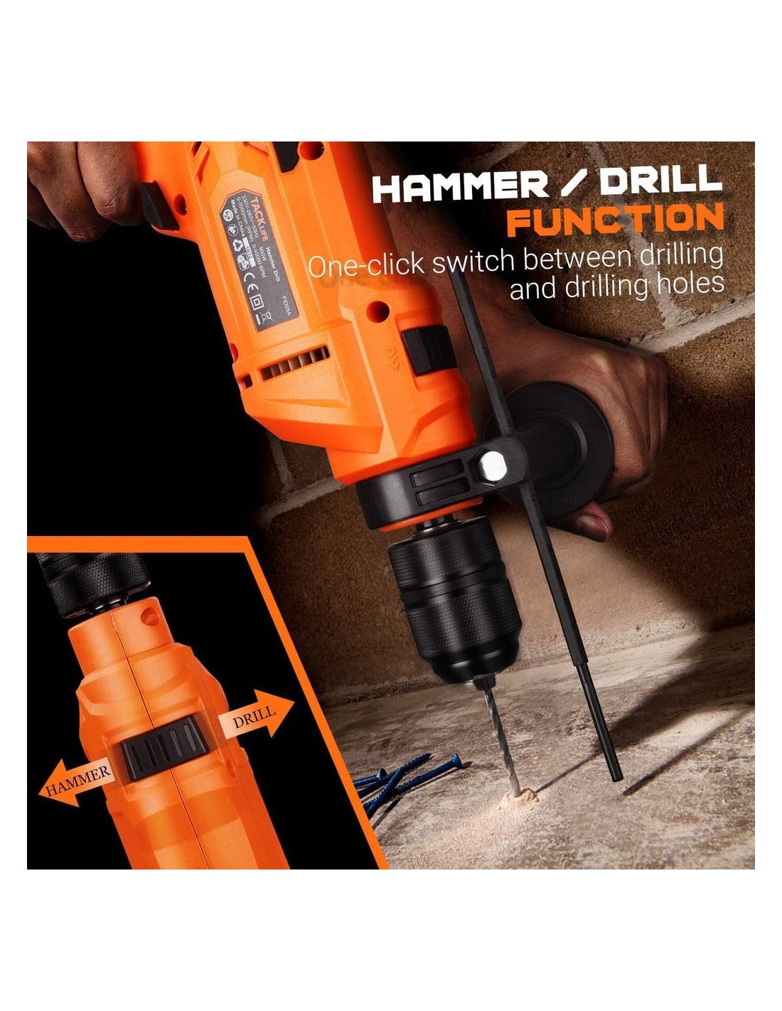 - Λειτουργίες σφύρας και τρυπανιού 2 σε 1: Αλλάξτε το μαύρο κουμπί στο επάνω μέρος για να επιλέξετε λειτουργία σφύρας ή διάτρησης. Η λειτουργία κρουστικού τρυπανιού θα παρέχει μεγαλύτερη δύναμη κρούσης, εξοικονομώντας ενέργεια για εργασίες διάτρησης σκυροδέματος και τοιχοποιίας. Ανάλογα με τις εργασίες σας είναι κατάλληλο για τοποθέτηση πολυελαίου, τηλεόρασης, επίπλων, παραθύρων κα.