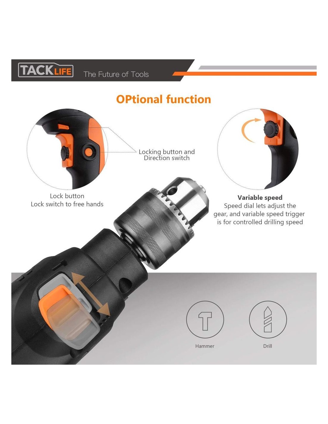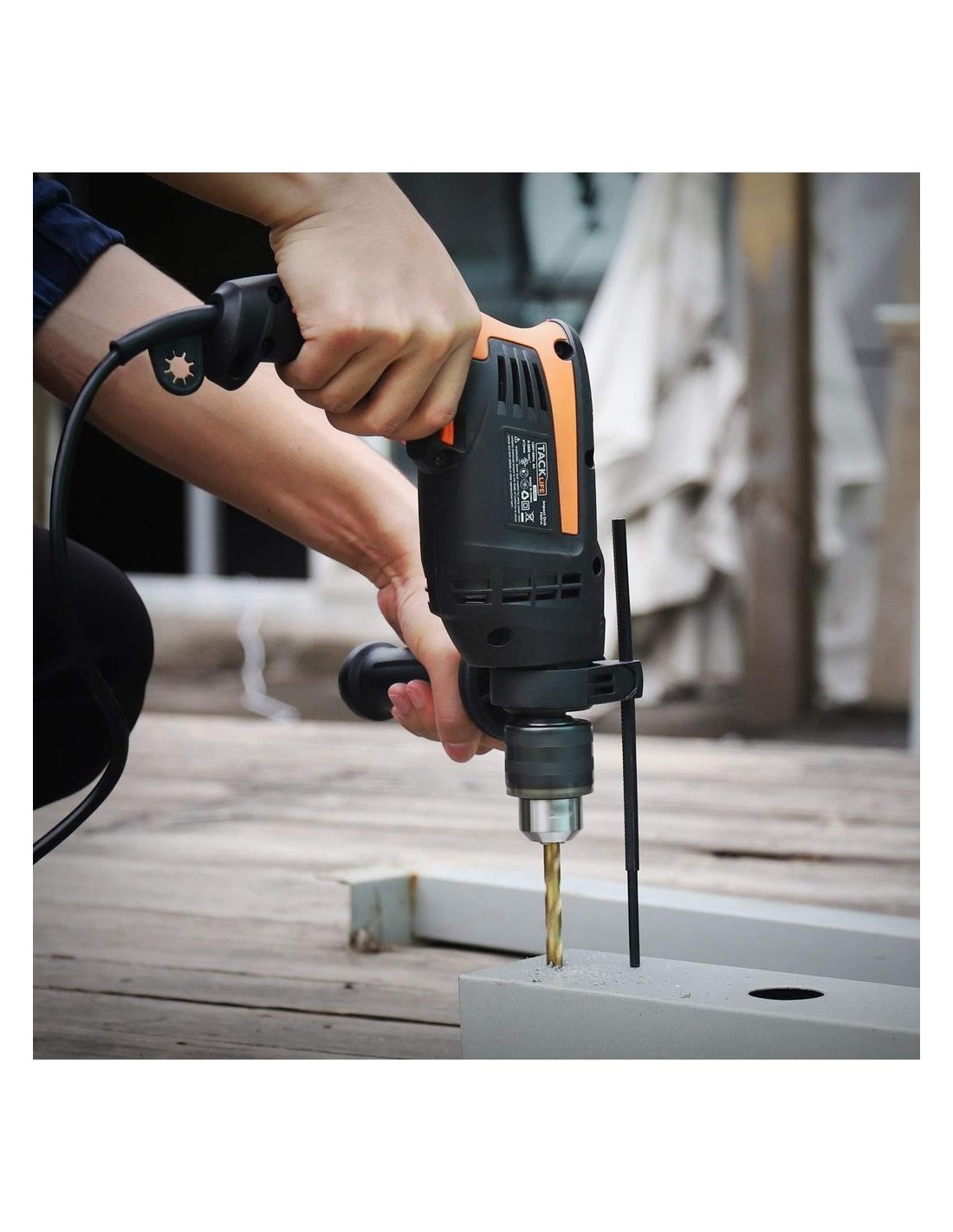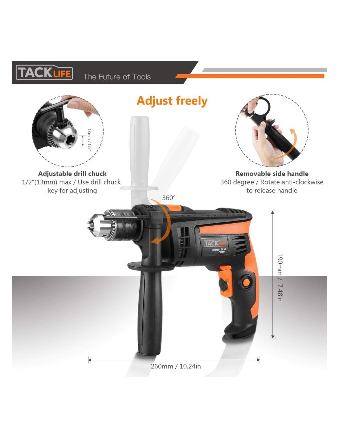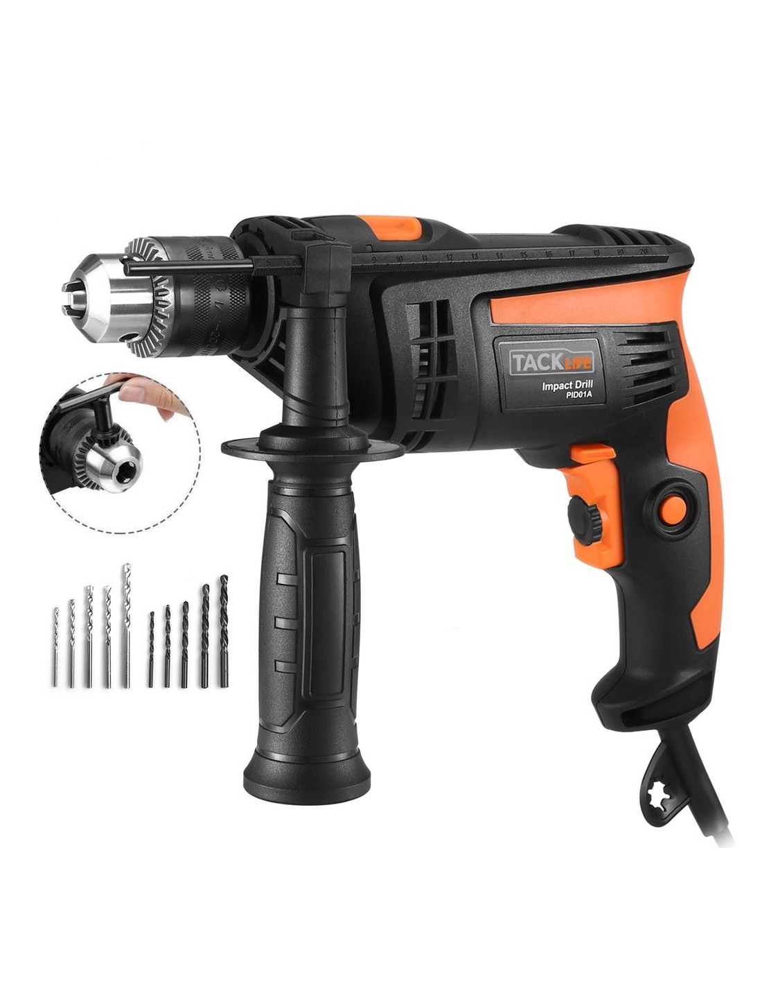 - Το κρουστικό δραπανοκατσάβιδο με διπλό καλώδιο tacklife διαθέτει περιστρεφόμενη βοηθητική λαβή, η οποία προσθέτει ευελιξία και προσφέρει καλύτερο κράτημα. Το μεταλλικό τσοκ είναι πιο ανθεκτικό και στιβαρό, επιτρέποντάς σας να αλλάζετε μια ποικιλία τρυπανιών με ευκολία. Η μέγιστη διάμετρος τσοκ αυτού του κρουστικού τρυπανιού είναι 1/2''(13mm).