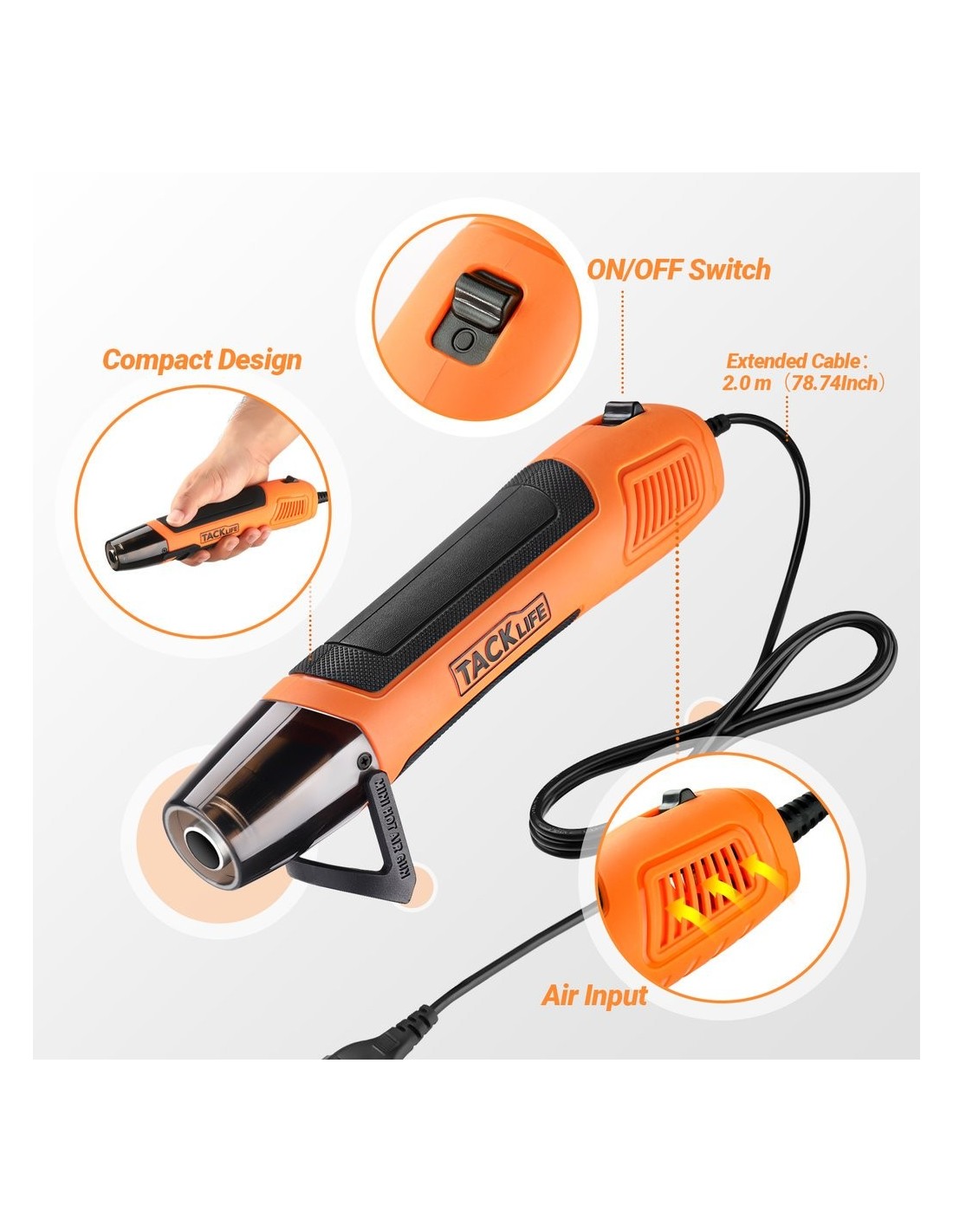 To πιστόλι θερμικής επεξεργασίας ΤacklifeHGP35AC χαρακτηρίζεται από ταχεία θέρμανση και υψηλή ισχύ. Η μέγιστη ισχύς είναι 350W και η μέγιστη θερμοκρασία φτάνει περίπου τους 350°C. Έχει απλό και ελαφρύ σχεδιασμό, φτιαγμένο με τα κατάλληλα υλικά ώστε να παρατείνεται η διάρκεια ζωής του εργαλείου. Μπορεί να χρησιμοποιηθεί για κάψιμο σκόνης, αφαίρεση παλιού χρώματος, απόψυξη και αφαίρεση βρωμιάς κ.λπ. Είναι κατάλληλο για DIY εργασίες. Η μπαταρία 2M και το πολύ μακρύ καλώδιο τροφοδοσίας επεκτείνουν την περιοχή εργασίας σας.