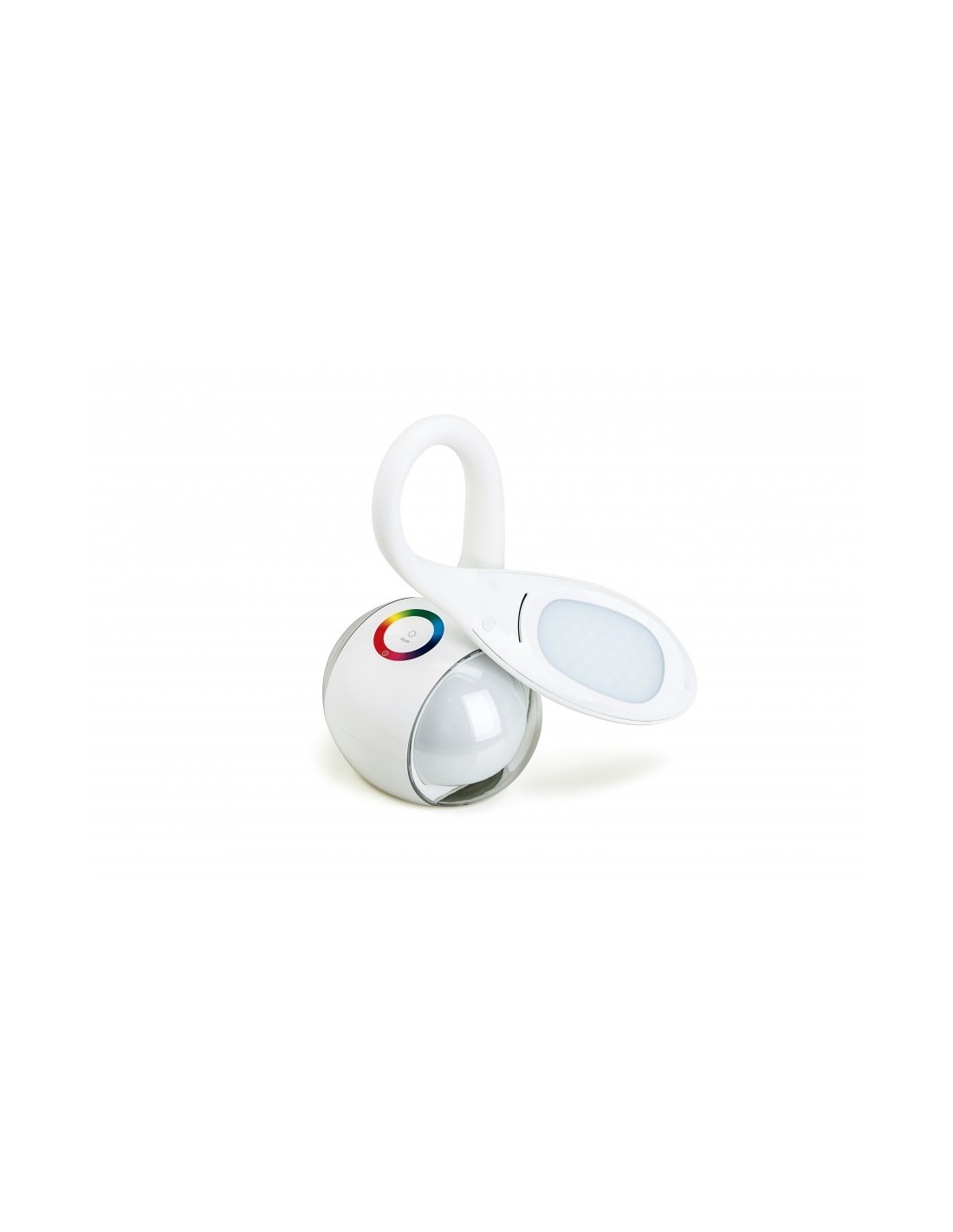 Μοντέρνο φωτιστικό γραφείου με ενσωματωμένο LED, κατασκευασμένο από πλαστικό σε λευκό χρώμα. Το φωτιστικό διαθέτει πλήκτρο αφής ΟΝ/OFF, ευλύγιστο βραχίονα καθώς και εναλλαγή χρωμάτων (RGB) στη βάση του. Επίσης μπορείτε να επιλέξετε την ένταση φωτισμού που χρειάζεστε. Η κατανάλωση της φωτεινής πηγής είναι στα 5.5W με θερμοκρασία χρώματος 4000Κ φυσικό λευκό.