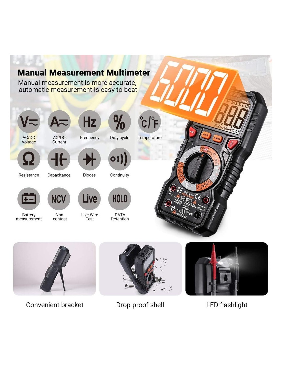 ΜΕΓΑΛΗ LCD ΜΕ ΟΠΙΣΘΙΟ ΦΩΣ Ως μεγάλη οθόνη LCD, έχει 6000 μετρήσεις με οπίσθιο φωτισμό. Οι 6000 μετρήσεις κάνουν το εύρος μέτρησής του αρκετά ευρύ και ο οπίσθιος φωτισμός και το φως LED το καθιστούν εύκολο στη χρήση σε σκοτεινές συνθήκες. Η δοκιμή μπορεί να επιτευχθεί χωρίς φυσική επαφή για τον επαγωγικό ανιχνευτή NCV.