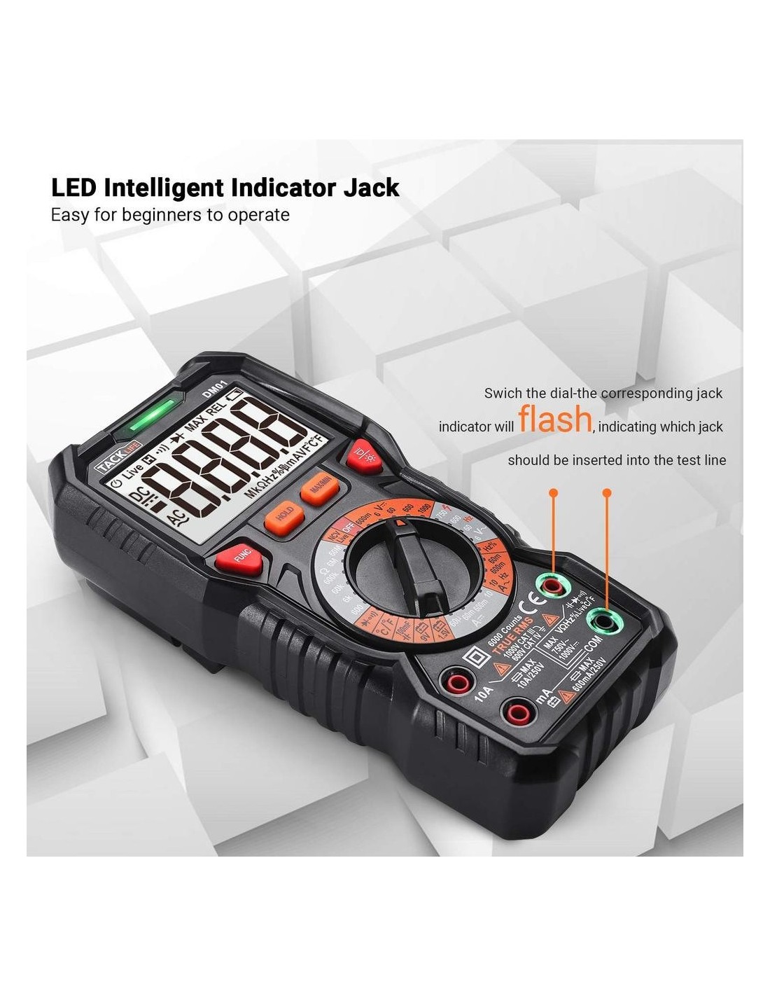 ΕΞΥΠΝΟ LED JACK Για να διευκολύνουμε τους χρήστες να χρησιμοποιούν ένα πολύμετρο, δημιουργήσαμε μια κορυφαία σχεδίαση. Έξυπνη υποδοχή ένδειξης LED. Λύνει το πρόβλημα ότι οι χρήστες έχουν πάντα αμφιβολίες για την επιλογή της πρίζας όταν χρησιμοποιούν ένα πολύμετρο. Με αυτό το όργανο, δεν χρειάζεται πλέον να ανησυχείτε. Αλλάξτε τον επιλογέα για να επιλέξετε τη λειτουργία που χρειάζεστε, η αντίστοιχη λυχνία LED αναβοσβήνει για να σας πει ποιο Jack πρέπει να επιλέξετε.