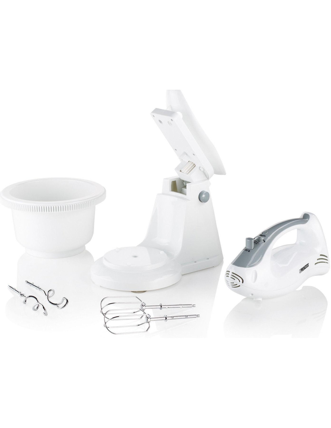 Αυτό το μίξερ Princess διαθέτει περιστρεφόμενο κάδο χωρητικότητας 2.0L, 2 γάντζους ζύμης και 2 ροδέλες. Ο αναμείκτης χειρός μπορεί επίσης να χρησιμοποιηθεί ξεχωριστά και έχει λειτουργία turbo, λειτουργία εξαγωγής και 5 θέσεις ταχύτητας!