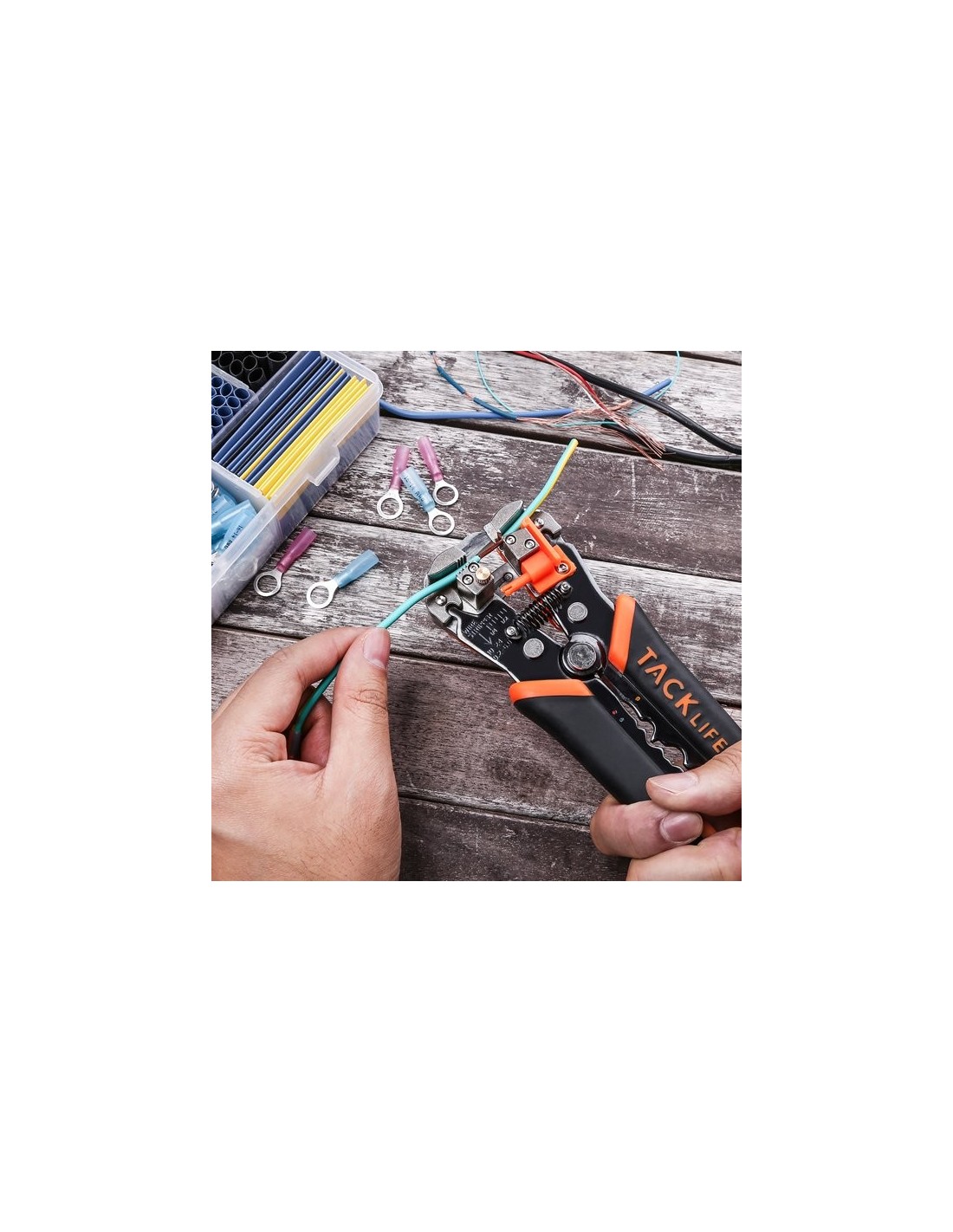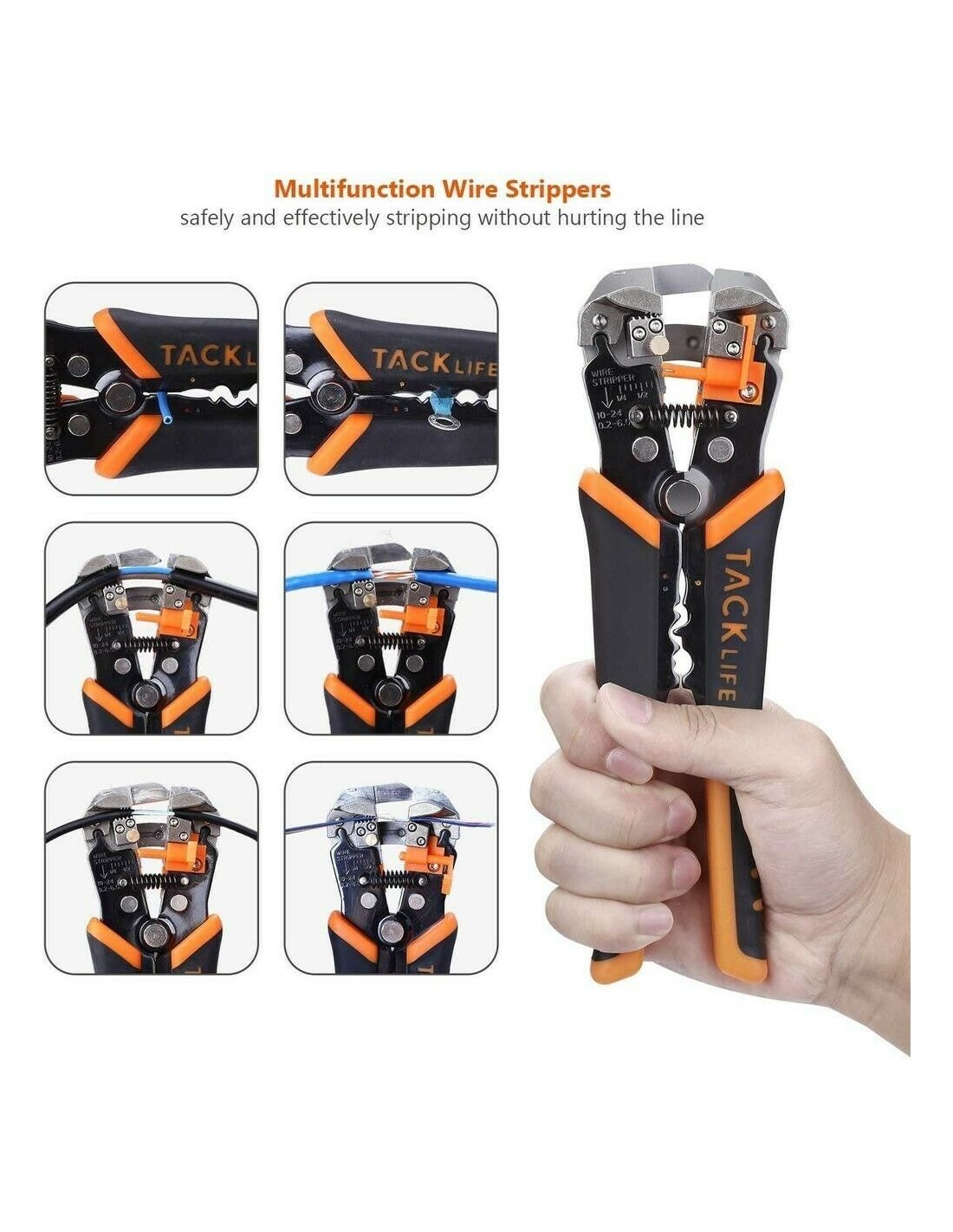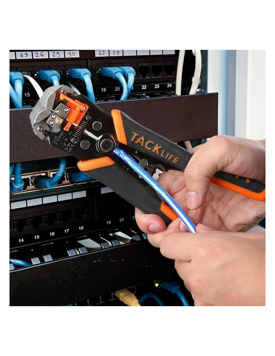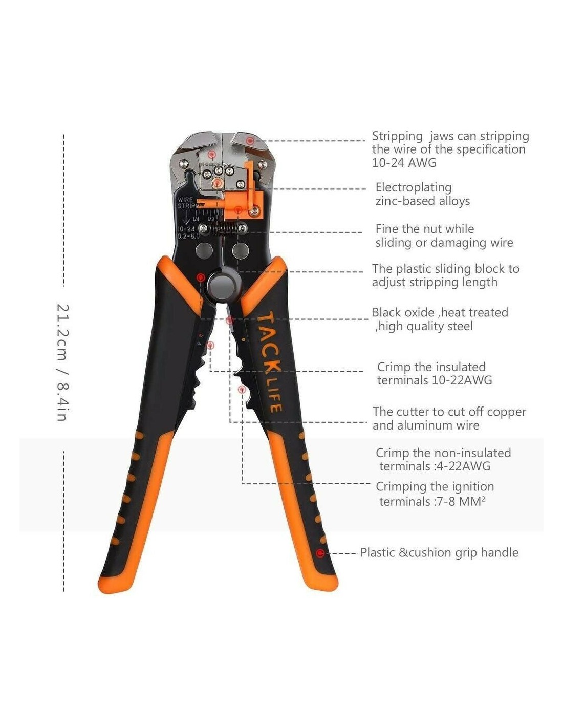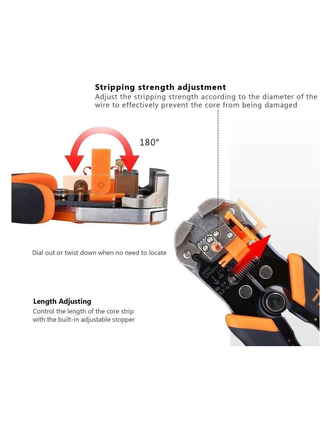 Αυτορρυθμιζόμενος αυτόματος απογυμνωτής καλωδίων που μπορεί να αντιμετωπίσει εύκολα και επαρκώς εργασίες απογύμνωσης κοπής και πτύχωσης. Αυτή η πολυλειτουργική πένσα 3 σε 1 είναι ένα γενικό εργαλείο χειρός για ηλεκτρολόγους ή ηλεκτρικές εγκαταστάσεις. Κατάλληλος σχεδιασμός με αυτορρυθμιζόμενες σιαγόνες για απογύμνωση καλωδίων από 10AWG έως 24 AWG (0,2-6mm²), το μεσαίο χάλκινο περιστρεφόμενο πόμολο είναι ειδικά σχεδιασμένο για την ακριβή ρύθμιση των δύο κατεργασμένων σιαγόνων για διαφορετικές εφαρμογές.